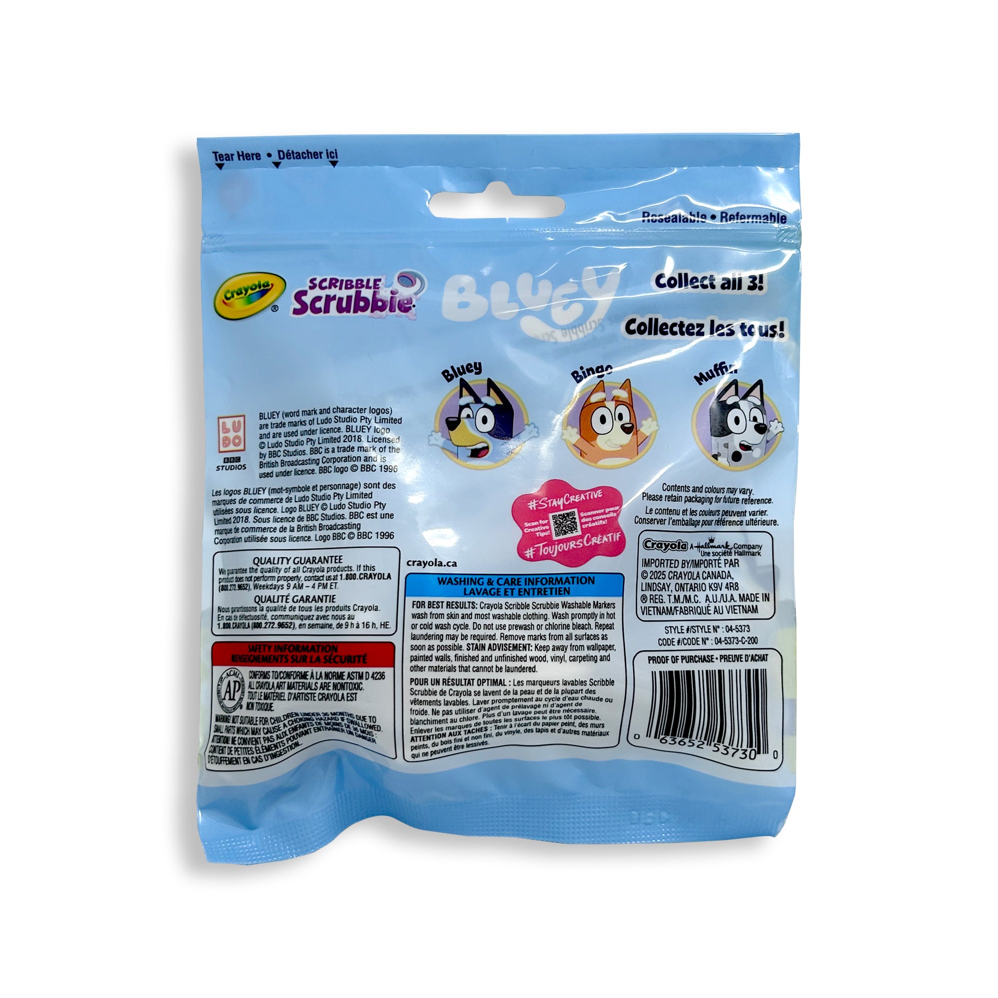 Kids will be thrilled to go on an epic adventure with the Crayola Scribble Scrubbies Bluey 1 count Toy. This Scribble Scrubbies Expansion Pack allows kids to add their favourite Bluey characters to their Scribble Scrubbie Pets collection. This 1 count kit comes with 1 of 3 characters (Bluey, Bingo, or Muffin), 2 Washable Markers and a Scrub Brush, perfect for creating fun spots on their new friend's fur or giving their playful pup an adorable costume. Little artists can colour and personalize their pet pup, then give them a scrub down and start the creative fun all over again! Both washable markers magically rinse from skin and most fabrics for stress-free creativity. This Scribble Scrubbies Expansion Pack is not just a Bluey toy for kids, but a journey into a world of creativity and colour. Safe, nontoxic, and perfect for gifting to both boys and girls. Recommended for ages 3 and up.