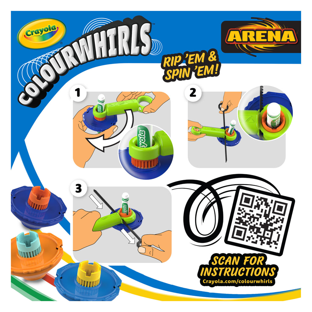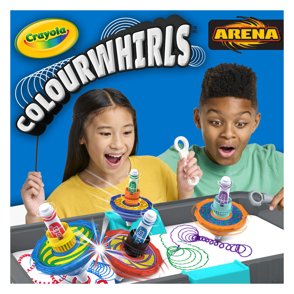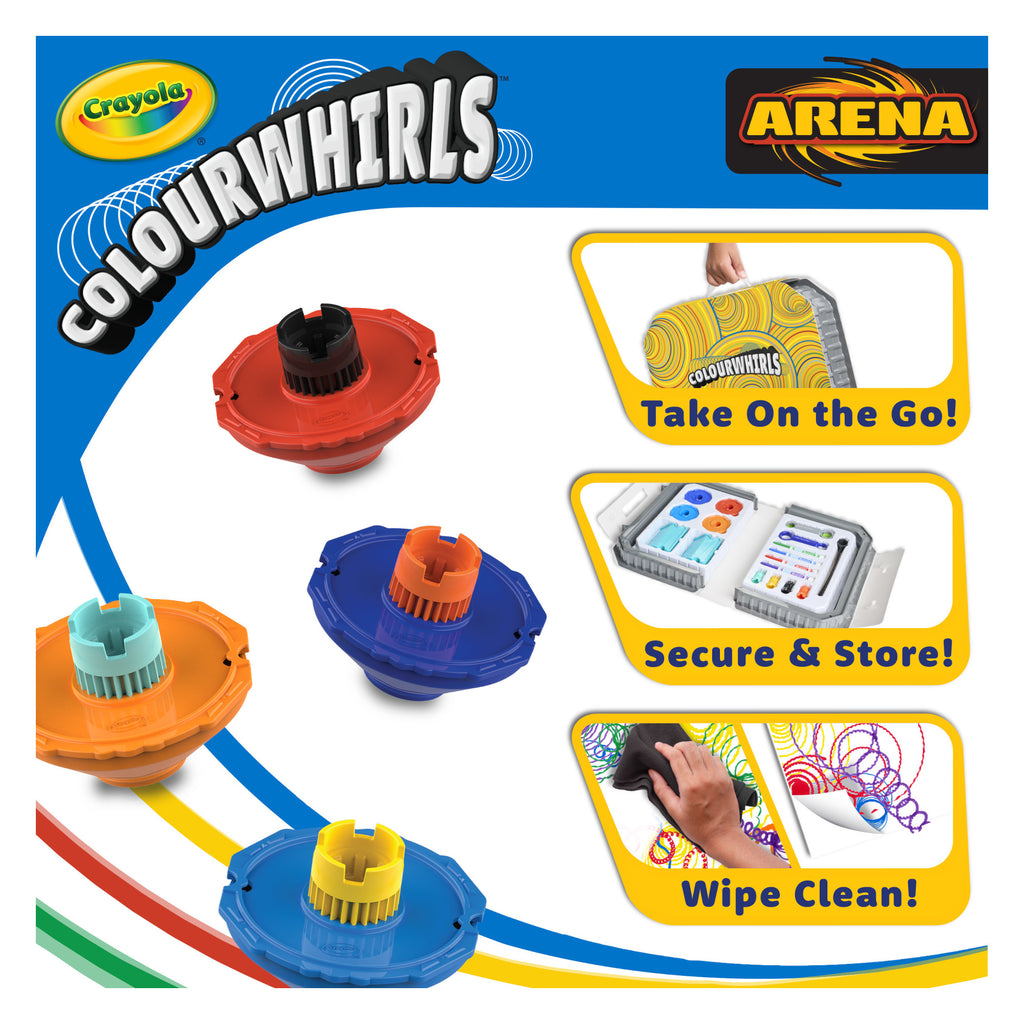 CRAYOLA COLOURWHIRLS ARENA SET: Compete in a whirlwind battle of creativity with the Colourwhirls Arena Set, which includes a large Colourwhirls Arena for up to 4 competitors, 4 Crayola Colourwhirl Toys (spinner, handle, rip cord, adaptor, marker holder), 4 Crayola Ultra Clean Broad Line Markers, 2 Ramps for exciting launches, and a carrying case for on the go fun.