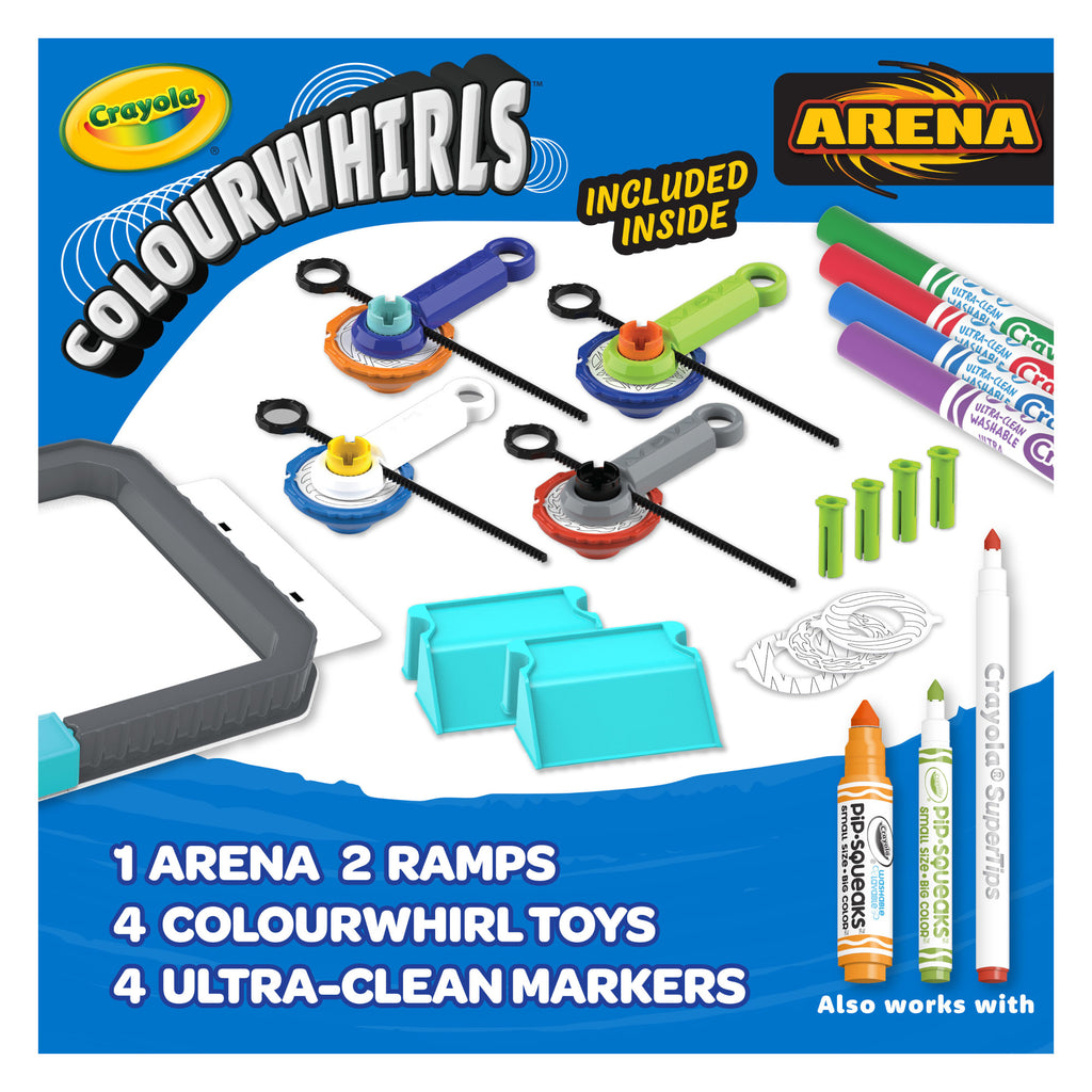 Includes 1 Colourwhirls Arena & Carrying Case, 4 Crayola Colourwhirl Toys (spinner, handle, rip cord, adaptor, marker holder), 4 Crayola Ultra Clean Broad Line Markers and 2 Ramps.