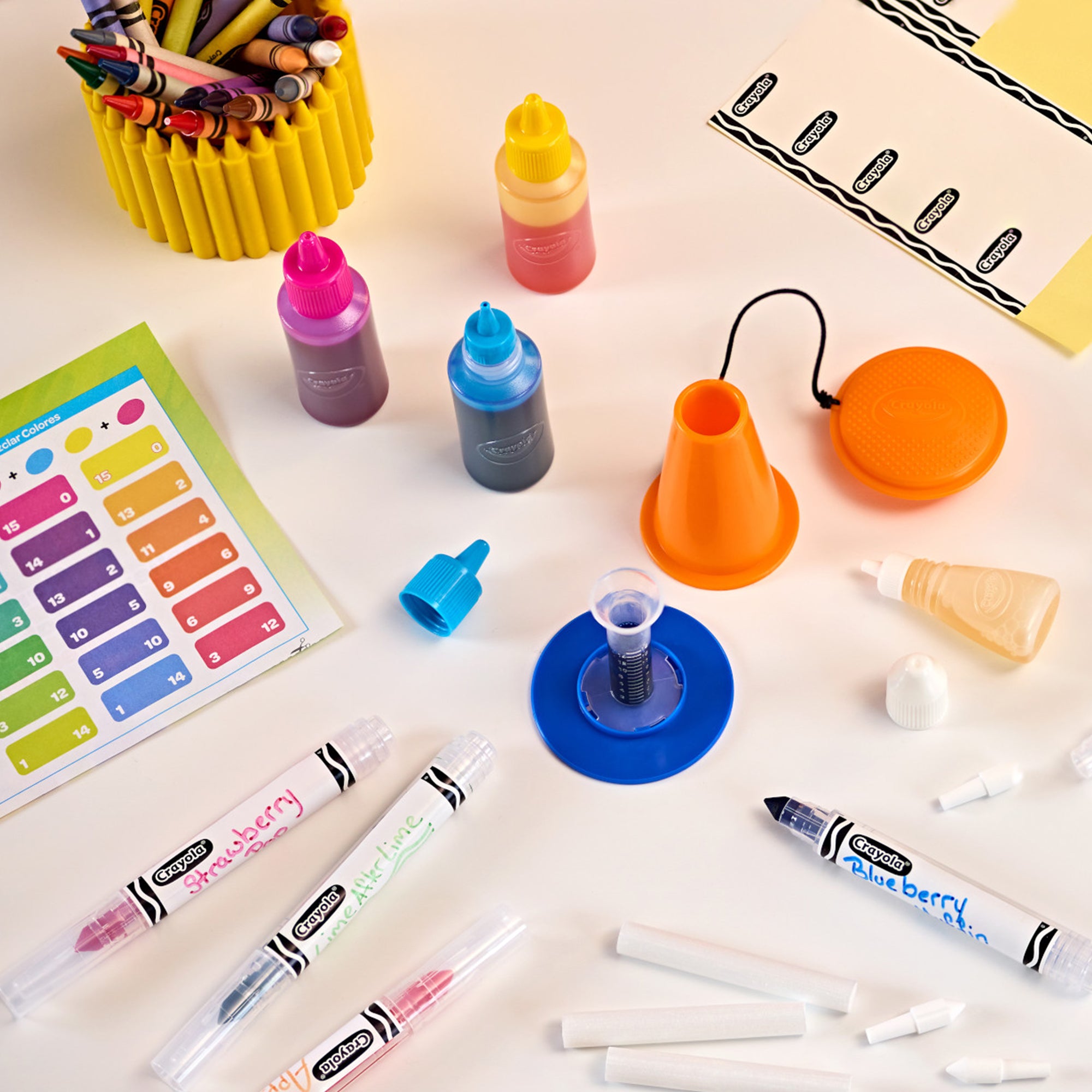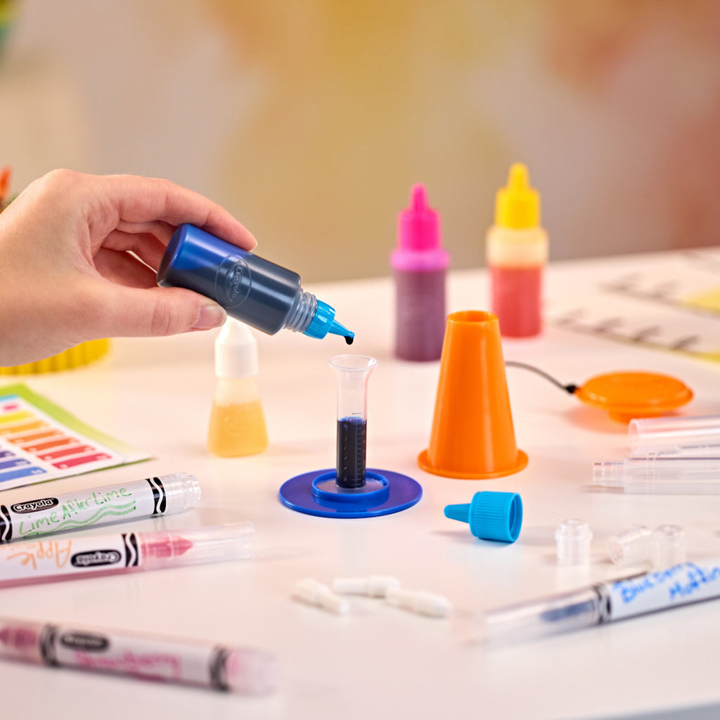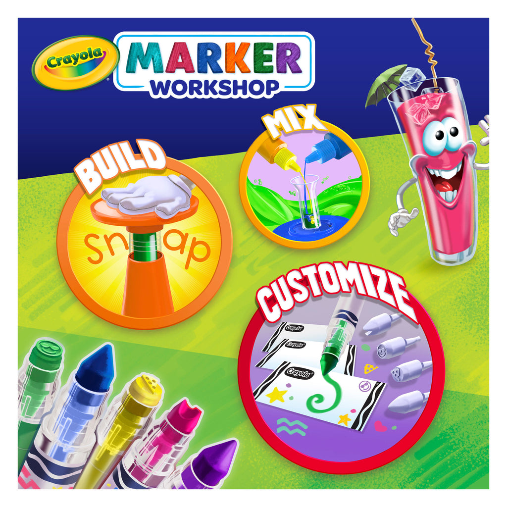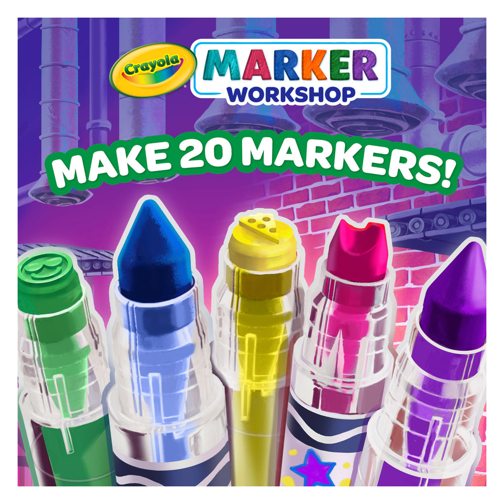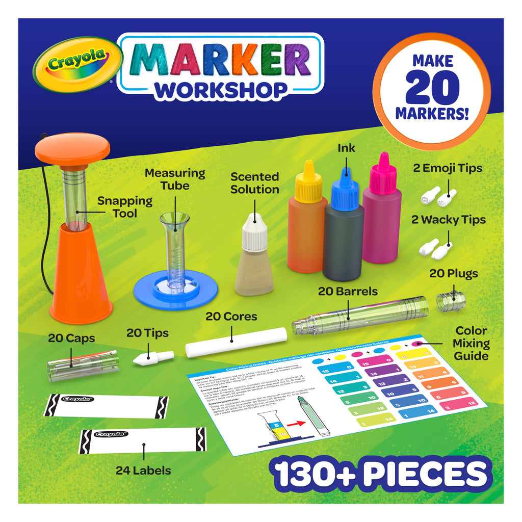 CRAYOLA MARKER WORKSHOP: Dive into creativity and build 20 Crayola Markers using the included Marker Assembler, 1 Measuring Vial, 3 vibrant Ink Bottles, 1 fruity Scented Ink Bottle (Fruit Punch), 24 Marker Labels, 2 Wacky Nibs, and 2 Emoji Nibs.